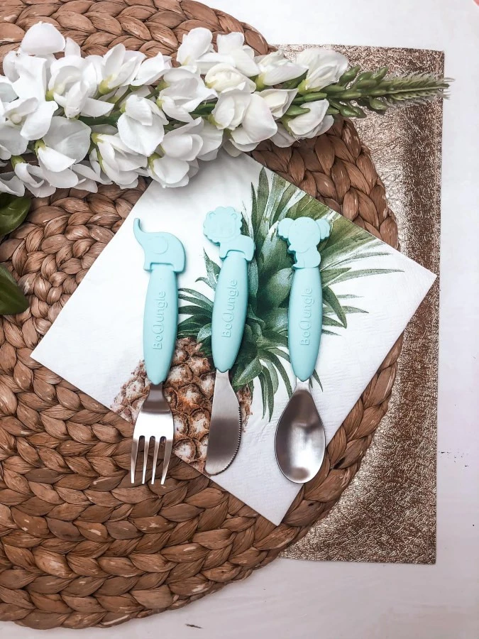Het bestek heeft een siliconen handgreep in combinatie met roestvrij staal. De schattige dierenfiguurtjes (koala, leeuw en olifant) maakt het zelfstandig leren eten meteen stuk leuker! Smakelijk eten!